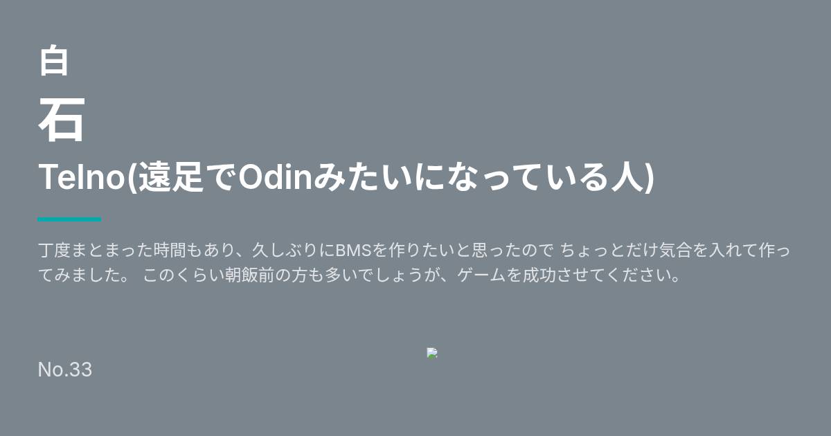 丁度まとまった時間もあり、久しぶりにBMSを作りたいと思ったので ちょっとだけ気合を入れて作ってみました。 このくらい朝飯前の方も多いでしょうが、ゲームを成功させてください。