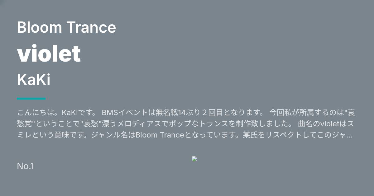 こんにちは。KaKiです。 BMSイベントは無名戦14ぶり2回目となります。 今回私が所属するのは"哀愁党"ということで"哀愁"漂うメロディアスでポップなトランスを制作致しました。 曲名のvioletはスミレという意味です。ジャンル名はBloom Tranceとなっています。某氏をリスペクトしてこのジャンル名にしました。 どうぞよろしくお願い致します。 (KaKi)