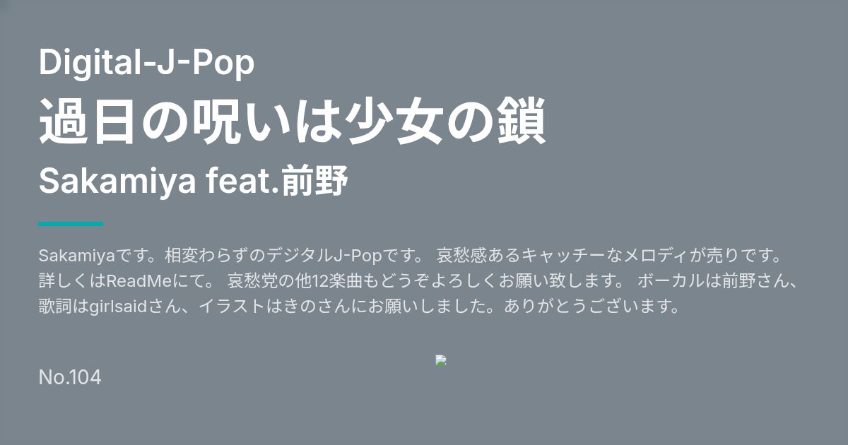 Sakamiyaです。相変わらずのデジタルJ-Popです。 哀愁感あるキャッチーなメロディが売りです。 詳しくはReadMeにて。 哀愁党の他12楽曲もどうぞよろしくお願い致します。 ボーカルは前野さん、歌詞はgirlsaidさん、イラストはきのさんにお願いしました。ありがとうございます。