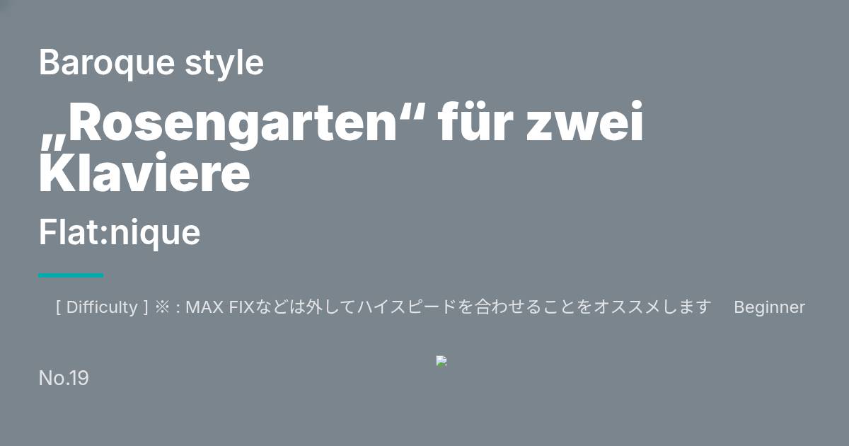 [ Difficulty ] ※ : MAX FIXなどは外してハイスピードを合わせることをオススメします Beginner [Jungfrau] ☆3 413Notes Total : 296 (Total/Notes : 0.717) #Rank : Easy [LN] Normal [Erste Liebe] ☆7 695Notes Total : 393 (Total/Notes : 0.565) #Rank : Easy [LN] Hyper [Rosen Mädchen] ☆11 1123Notes Total : 482 (Total/Notes : 0.429) #Rank : Easy [LN] Another [Puppenmacherin] ☆12 1325Notes Total : 520 (Total/Notes : 0.392) #Rank : Easy [LN] ※ Insane [Teufelin] ★9 1603Notes Total : 590 (Total/Notes : 0.368) #Rank : Easy [LN] ※ -- この度エスニック党から立候補したふらっと(Flat:nique)です。 タイトルは「2台のピアノのための「薔薇の園」」です。 前々から作ってみたかったんですバロック時代のクラシック風。 ガッツリクラシックやってる人から見ると色々おかしいかも・・・_(:3」∠)_ 曲の流れ聴くと恐らく分かりますが、本家のあの曲とかあの曲とかのリスペクトです。 タイトルは薔薇の乙女のアレです。翠と紅が好きです。 この曲ではどっちかっていうと紅色が強いかも? エスニック党としてバロック音楽の良さをゴシックと合わせてたっぷり詰め込みました。 「バロック」や「ゴシック」のイメージを感じて頂ければと思います。 -- [追記1] BGIと直し忘れてBGAになってますが致命的なミスでもないのでこの点について修正はしません(既にプレイしている人に申し訳ないので…) [追記2]同梱readmeには再配布禁止とありますが、パッケージ化については全くもって構いません。よろしくお願いします。
