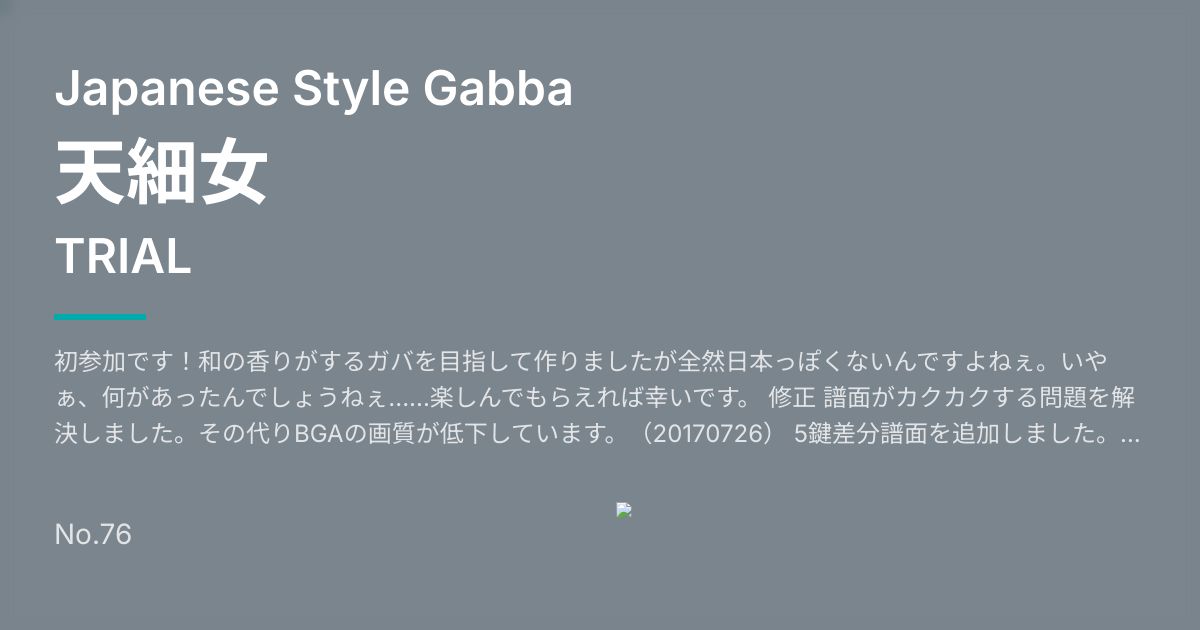 初参加です!和の香りがするガバを目指して作りましたが全然日本っぽくないんですよねぇ。いやぁ、何があったんでしょうねぇ......楽しんでもらえれば幸いです。 修正 譜面がカクカクする問題を解決しました。その代りBGAの画質が低下しています。(20170726) 5鍵差分譜面を追加しました。(20170803)