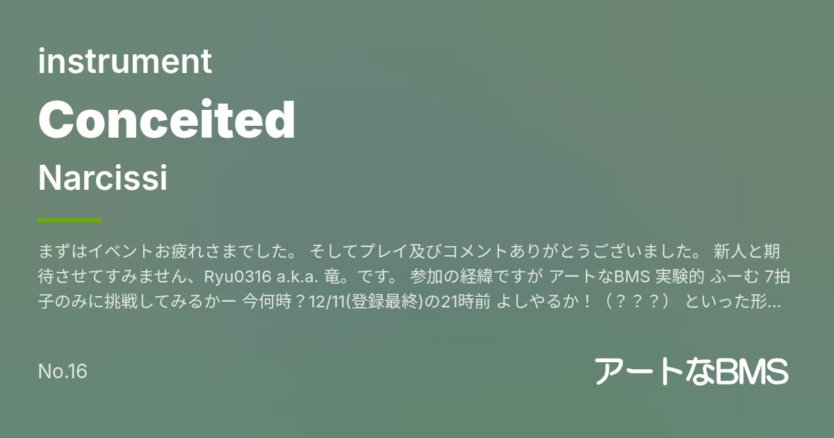 まずはイベントお疲れさまでした。 そしてプレイ及びコメントありがとうございました。 新人と期待させてすみません、Ryu0316 a.k.a. 竜。です。 参加の経緯ですが アートなBMS 実験的 ふーむ 7拍子のみに挑戦してみるかー 今何時?12/11(登録最終)の21時前 よしやるか!(???) といった形で創りました。非常にバカです。 曲に1時間半程、音切りと登録用1譜面に1時間程で、 曲名に偽名の名義にアップロード先だのわたわたして 終いには本名義で一回登録するっていう事故をしたり 仮bgiの定義を入れて配置忘れてたりと 改めて登録は余裕をもって1枚絵3譜面そろえて登録しようね!って思いました... 名義や曲名の意味は、水仙と花言葉のうぬぼれた 曲がちょっと浮かれてる感じがあったのと 自戒的なものです。 7拍子 イベントのアートとしての要素はこれだけです 前回のFleeting Revivalは4+3のリズム隊でしたが、 今回の7ではリズム隊特にスネアに悩みました。 ただコードや音の動きは4+3で作っています。 この先も何か7拍子作れたらいいなとは思っています。 譜面 7拍子のおかげかいつもの譜面スタイルに相乗効果があってうれしい。 が、やはり譜面の後出しはプレイされにくいということに再度気が付きました。 どうしても手間ですからね、これに関しては私が悪い。 改めてお疲れさまでした。 新しいことをしても割と綺麗に纏まるのが私の強みでもありちょっと難しい所かもしれないですね。 それでは、来年もまたどこかで。 ________________________________________________________ 7拍子 12/13 ogg本体の方にNHA譜面追加とその差分のみをアップロードしました ☆7の譜面はそのまま何もせず残しています。 お手数をおかけして水ま仙... ごめんなさい...
