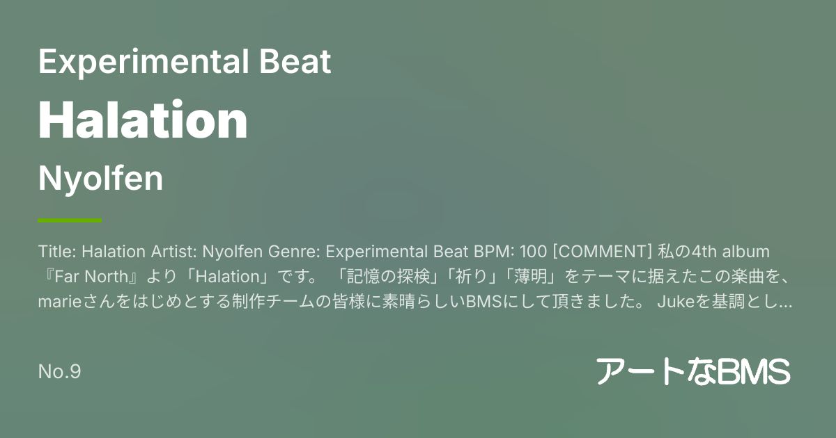 Title: Halation Artist: Nyolfen Genre: Experimental Beat BPM: 100 [COMMENT] 私の4th album『Far North』より「Halation」です。 「記憶の探検」「祈り」「薄明」をテーマに据えたこの楽曲を、marieさんをはじめとする制作チームの皆様に素晴らしいBMSにして頂きました。 Jukeを基調としたグルーヴに揺られながら、楽曲の世界に浸っていただければ幸いです。 This is "Halation" from my 4th album "Far North". The theme of this track is "exploration of memory", "prayer", and "twilight". The production team, led by marie, has given this a great BMS. I hope you will immerse yourself in the world of the song while swaying to the Juke-based groove. [PATTERNS] 5KEY: ☆4, ☆7 7KEY: ☆4, ☆10, ☆12 14KEY: ☆7, ☆10, ☆12 9KEY: Lv30, Lv40, Lv48 7KEY (Additional): ☆?, ★11, ★16, ★22, ★23, ★24, ★25 [CREDITS] Music - Nyolfen BGA - 空読無 白眼 Keysounds - marie Patterns - marie, Telperion, froji Additional Patterns - LuvTek, air, AXION, (#`ω´)9, sera, w