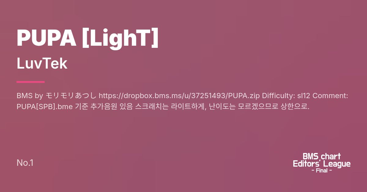 BMS by モリモリあつし https://dropbox.bms.ms/u/37251493/PUPA.zip Difficulty: sl12 Comment: PUPA[SPB].bme 기준 추가음원 있음 스크래치는 라이트하게, 난이도는 모르겠으므로 상한으로.