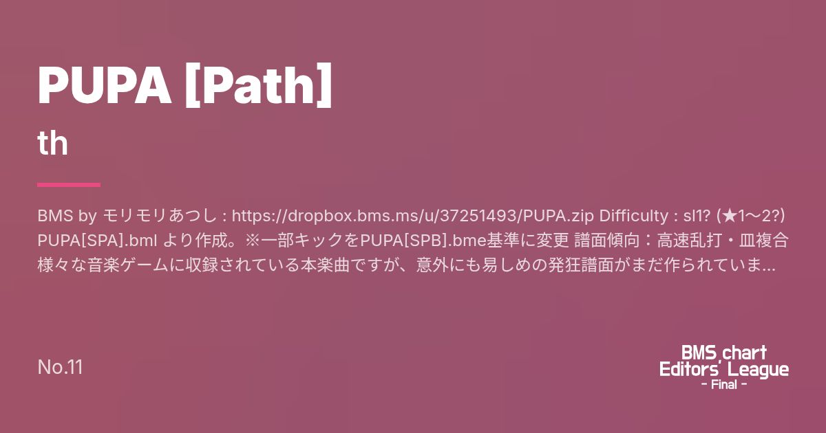 BMS by モリモリあつし : https://dropbox.bms.ms/u/37251493/PUPA.zip Difficulty : sl1? (★1~2?) PUPA[SPA].bml より作成。※一部キックをPUPA[SPB].bme基準に変更 譜面傾向:高速乱打・皿複合 様々な音楽ゲームに収録されている本楽曲ですが、意外にも易しめの発狂譜面がまだ作られていませんでした。 そこを埋め合わせるとともに、高速乱打の入門としてプレイヤーの道標となるような譜面を目指しました。 同梱譜面の意図を尊重して、ギミックはある程度原型を保ったままにしています。