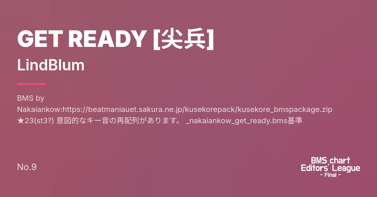 BMS by Nakaiankow:https://beatmaniauet.sakura.ne.jp/kusekorepack/kusekore_bmspackage.zip ★23(st3?) 意図的なキー音の再配列があります。 _nakaiankow_get_ready.bms基準