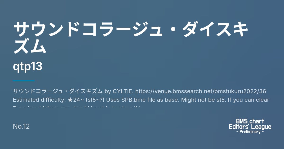 サウンドコラージュ・ダイスキズム by CYLTIE. https://venue.bmssearch.net/bmstukuru2022/36 Estimated difficulty: ★24~ (st5~?) Uses SPB.bme file as base. Might not be st5. If you can clear Duarrier st4 then you should be able to clear this.