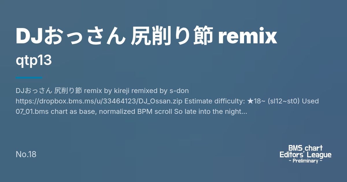 DJおっさん 尻削り節 remix by kireji remixed by s-don https://dropbox.bms.ms/u/33464123/DJ_Ossan.zip Estimate difficulty: ★18~ (sl12~st0) Used 07_01.bms chart as base, normalized BPM scroll So late into the night...