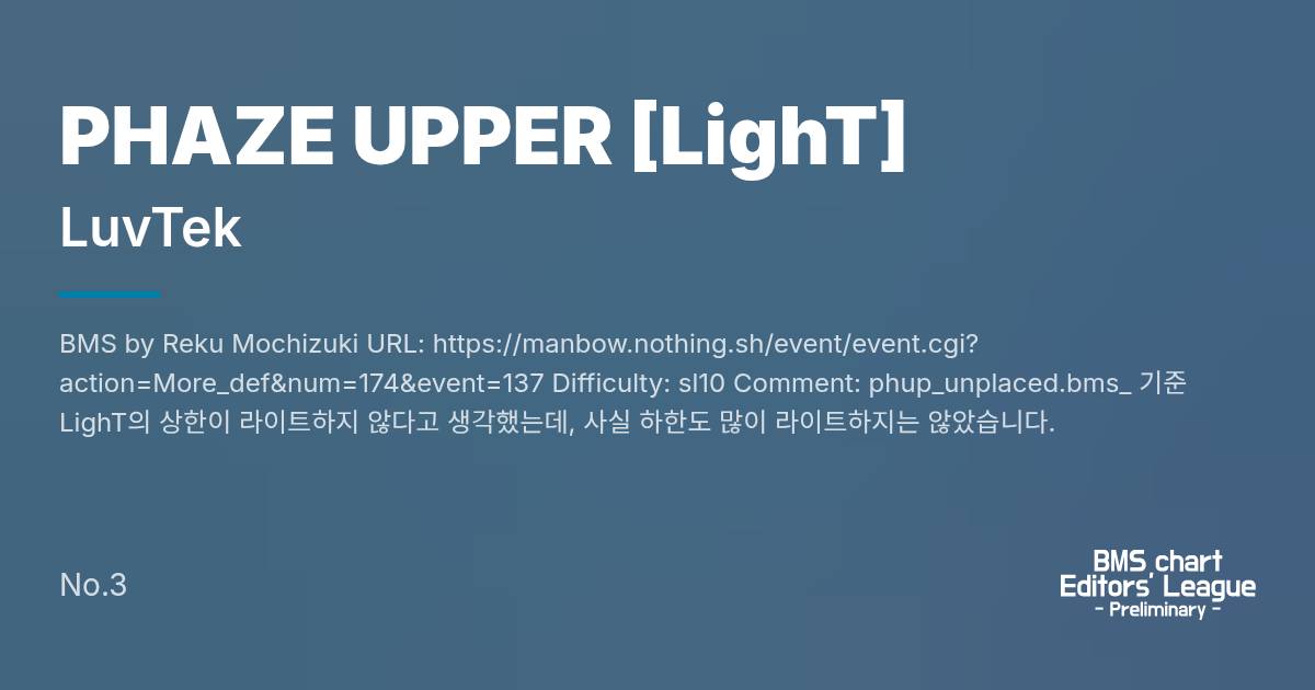 BMS by Reku Mochizuki URL: https://manbow.nothing.sh/event/event.cgi?action=More_def&num=174&event=137 Difficulty: sl10 Comment: phup_unplaced.bms_ 기준 LighT의 상한이 라이트하지 않다고 생각했는데, 사실 하한도 많이 라이트하지는 않았습니다.