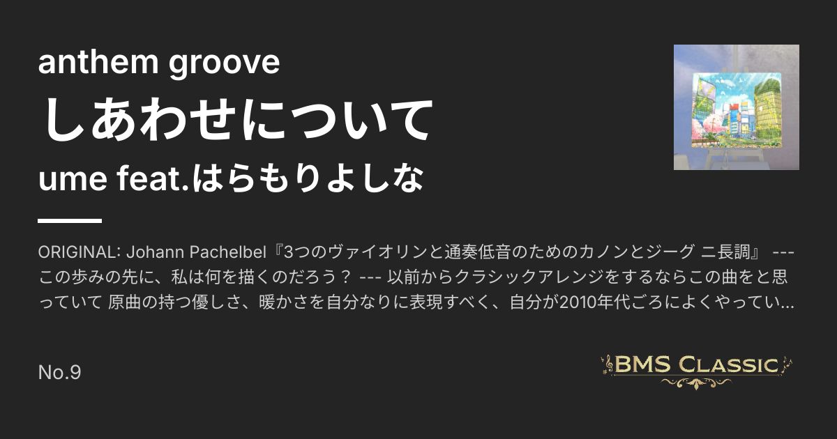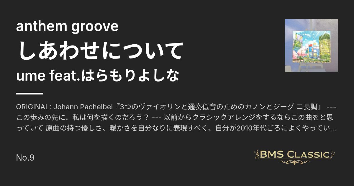 ORIGINAL: Johann Pachelbel『3つのヴァイオリンと通奏低音のためのカノンとジーグ ニ長調』 --- この歩みの先に、私は何を描くのだろう? --- 以前からクラシックアレンジをするならこの曲をと思っていて 原曲の持つ優しさ、暖かさを自分なりに表現すべく、自分が2010年代ごろによくやっていたスタイルを引っ張り出して製作しました。 特別な道でなくても、日々見つけた歓びを色に変え、一筆ずつ重ねていく、そんな歩みをテーマに製作しました。 はらもりよしなさんの歌唱、Roiseさんのイラストの力により、目指していた優しさのある世界観を表現できたと思います。 そんな感じでよろしくお願いいたします。 (ume) 「しあわせについて」のボーカルを担当させていただきました、はらもりよしなです。 今回クラシックアレンジのBMSという事で、きれいに丁寧に歌えるように頑張りました…! ちなみに古の音ゲーマー的にクラシックのボーカルアレンジと聞くと嬉しくなっちゃいますね。何のことだか分かる方はそっと。わたしに教えて下さいね! (はらもりよしな) しあわせなまちづくりしました、Roise(ろわい)です。 うめさんの素敵な曲とはらもりよしなさんのボーカルと共に渋谷の街がだんだんイキイキしていく様子が描かれていくのにただただ感動しております、本当にありがとうございます……。 ぜひとも楽しんでくださると幸いです! (Roise)