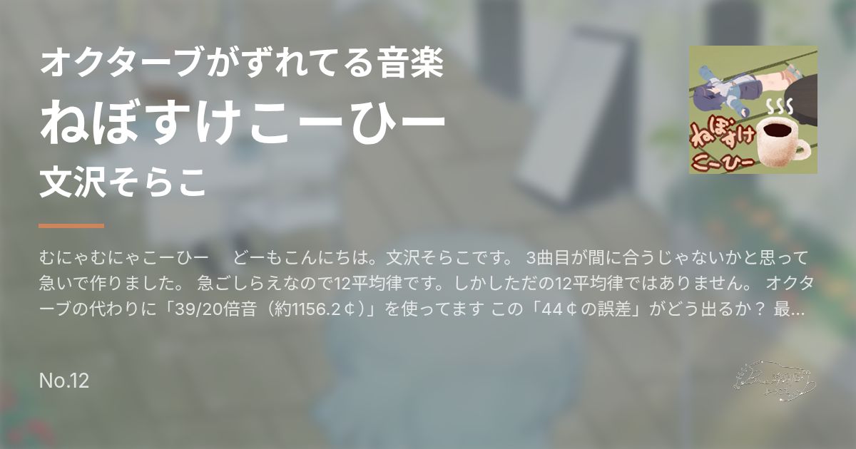 むにゃむにゃこーひー どーもこんにちは。文沢そらこです。 3曲目が間に合うじゃないかと思って急いで作りました。 急ごしらえなので12平均律です。しかしただの12平均律ではありません。 オクターブの代わりに「39/20倍音(約1156.2¢)」を使ってます この「44¢の誤差」がどう出るか? 最高難易度はクリアさせないつもりで作りました。逆ボしたからってふて寝しないでください。 BGIの女の子:もち山金魚さんとこのうささきちゃん