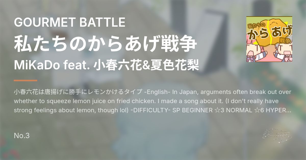 小春六花は唐揚げに勝手にレモンかけるタイプ -English- In Japan, arguments often break out over whether to squeeze lemon juice on fried chicken. I made a song about it. (I don't really have strong feelings about lemon, though lol) -DIFFICULTY- SP BEGINNER ☆3 NORMAL ☆6 HYPER ☆9 ANOTHER ☆11 大盛り ★5(sl3) 特盛り ★13(sl8) バカ盛り ★25(st7) 9K NORMAL ☆29 HYPER ☆42 EX ☆48