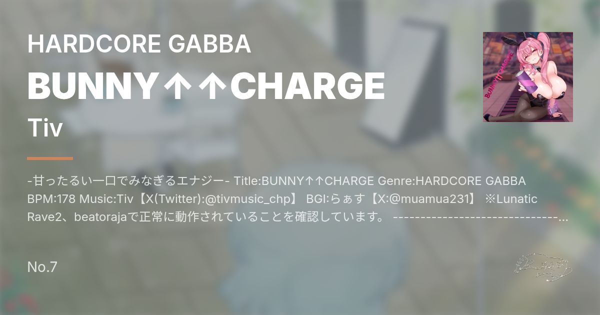 -甘ったるい一口でみなぎるエナジー- Title:BUNNY↑↑CHARGE Genre:HARDCORE GABBA BPM:178 Music:Tiv【X(Twitter):@tivmusic_chp】 BGI:らぁす【X:@muamua231】 ※Lunatic Rave2、beatorajaで正常に動作されていることを確認しています。 --------------------------------------------------- comment Music:Tiv テーマは「エナジードリンク」。喫茶店イベントのはずなのに3作品全部雰囲気にそぐわないという半ば逆張りをかましておりますが… ちゃんと説得力あるように仕上げましたのでお許しを…! エナジードリンクと聞くと、「ジャンキー」「徹夜」など、多少治安悪めなワードを思い浮かべるので、それらをイメージして作ってみました。 眠気が一気に覚めたというハイテンションぶりも表現できているかなと思います。 BGIは「New-towN」でお馴染みのらぁすさんにお願いさせていただきました。今回もありがとうございました! タイトルに「BUNNY」とありますが、何故BGIにバニーガールなのか? こういう雰囲気のお姉さんが何かのイベントでエナジードリンク配布してそうだなぁ… というのは後付けの理由で、単純に好きだからです。はい。すいません。 それはそうと、どことなく誘惑的な雰囲気がめちゃくちゃ良き…。 あとどこと(ry 譜面に関しては、RaMen BrEaKと同じくたまに微縦が入っているので、いつものと比べるとそれなりにスパイスがあるんじゃないでしょうか。 目覚めの一杯になるようなどデカいサウンドが満載なので、ガンギマリな目でお楽しみいただけますと幸いです。 ポータルサイト(これを見ればTivがどんな人か大体わかる) https://sukestonepyua.wixsite.com/tivsukehome X(Twitter)(気ままにつぶやいたり宣伝したり) https://twitter.com/tivmusic_chp SoundCloud(音源保管はこちらで) https://soundcloud.com/tivremisuke YouTube(BGAや音源などを気まぐれで投稿) https://www.youtube.com/channel/UC3pMoThTt8gpoAHPsNfIi8Q 連絡用メアド(TwitterのDMが出来ない場合の問い合わせやリンク切れ報告に) tivdirectmass@gmail.com --------------------------------------------------- BGI:らぁす 今回描いた色気もあり魅力的に描けたので自分でも気に入ってます!