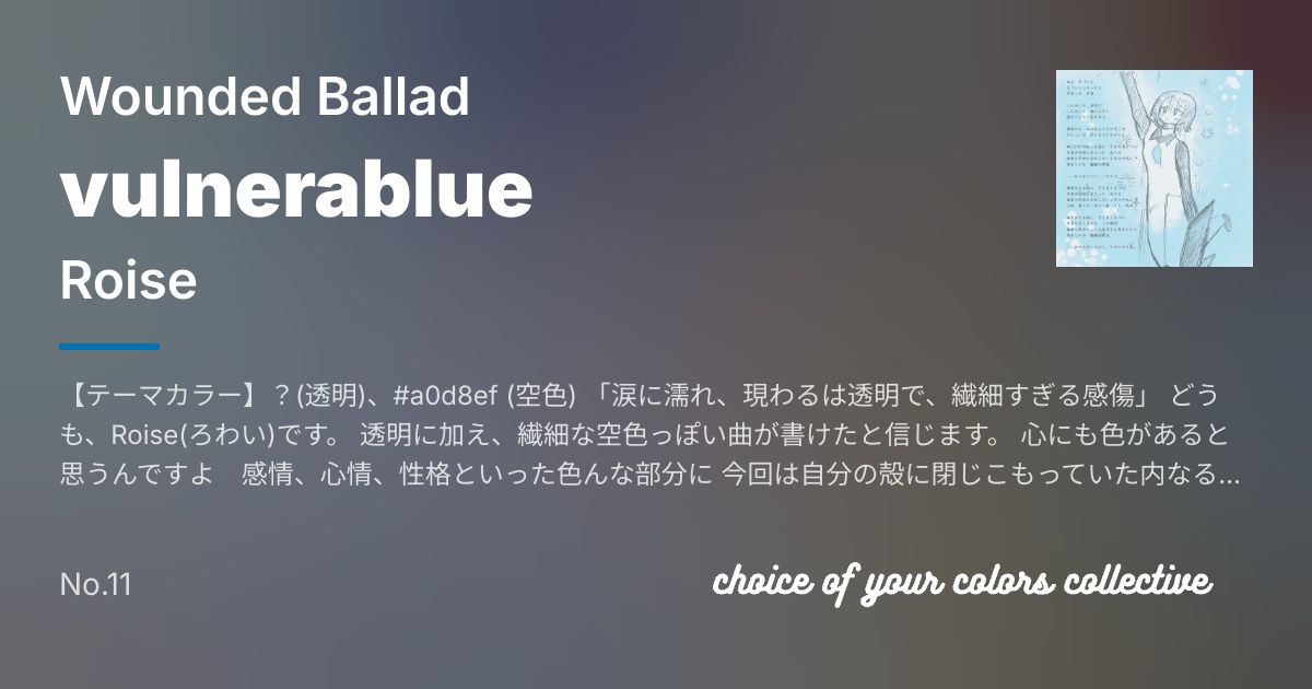 【テーマカラー】?(透明)、#a0d8ef (空色) 「涙に濡れ、現わるは透明で、繊細すぎる感傷」 どうも、Roise(ろわい)です。 透明に加え、繊細な空色っぽい曲が書けたと信じます。 心にも色があると思うんですよ 感情、心情、性格といった色んな部分に 今回は自分の殻に閉じこもっていた内なる自分を受容する、何度も傷つきまくって透明になってしまった心に再び色を付ける、そんな曲を目指して書いてみました よろしくお願いします すべては 繊細なる心のままに