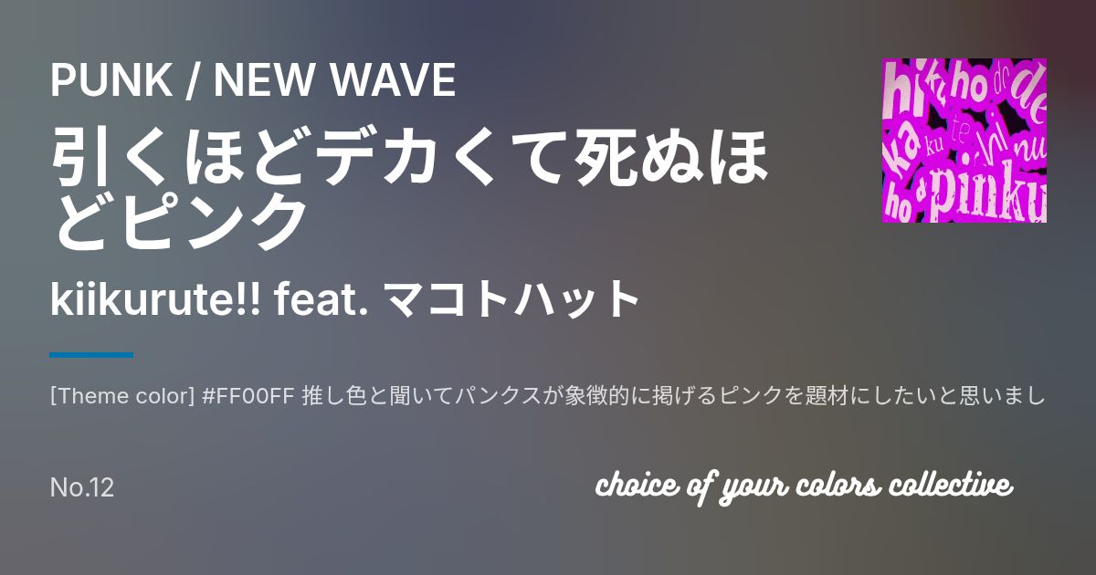 [Theme color] #FF00FF 推し色と聞いてパンクスが象徴的に掲げるピンクを題材にしたいと思いました BMSに落とし込むにあたり一度はダンスパンク当たりの落としどころを探っていたのですが 歌詞とSynthesizerVの調声で90年代前後のガチのパンクを聞き返していたら どんどんアレンジもパンク寄りに先祖返りしていき 最終的にはパンク/ニューウェーブあたりの歪さに辿り着きました せっかくなので強烈なシンセソロをお願いしたく 友人のマコトハットさんに依頼したところ 一晩でノイズソロが返ってきたのでサイコーとなって完成しました よろしくお願いします