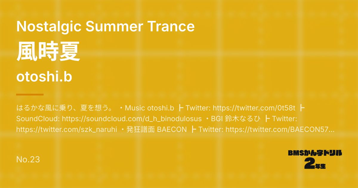 はるかな風に乗り、夏を想う。 ・Music otoshi.b ┣ Twitter: https://twitter.com/0t58t ┣ SoundCloud: https://soundcloud.com/d_h_binodulosus ・BGI 鈴木なるひ ┣ Twitter: https://twitter.com/szk_naruhi ・発狂譜面 BAECON ┣ Twitter: https://twitter.com/BAECON57 qfeileadh ┣ Twitter: https://twitter.com/qfeileadh SP Normal ☆4 SP Hyper ☆9 SP Another ☆11 SP Insane ☆12 (発狂★2, sl2) SP 晴海歌 obj:BAECON ☆12 (発狂★15, sl9) SP 夏海記 obj:BAECON ☆12 (発狂★24, st5) SP 大天空 obj:qfeileadh ☆12 (★★6, st10)