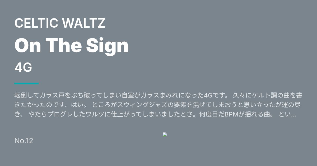 転倒してガラス戸をぶち破ってしまい自室がガラスまみれになった4Gです。 久々にケルト調の曲を書きたかったのです、はい。 ところがスウィングジャズの要素を混ぜてしまおうと思い立ったが運の尽き、 やたらプログレしたワルツに仕上がってしまいましたとさ。何度目だBPMが揺れる曲。 という訳でファンタジーな世界を渡り歩く行商人のイメージで作りました。ただし曲名が看板である。 ところどころASKAFROA(BOF2009に出したやつ)のメロディが混じってるのはご愛敬ということで。 ------------------------------------------------------------ 6/23 23:19 追記 画像ファイル入れ忘れてました申し訳ございません。 画像ファイルが必要な方は「入れ忘れてた画像」からダウンロードお願いします。