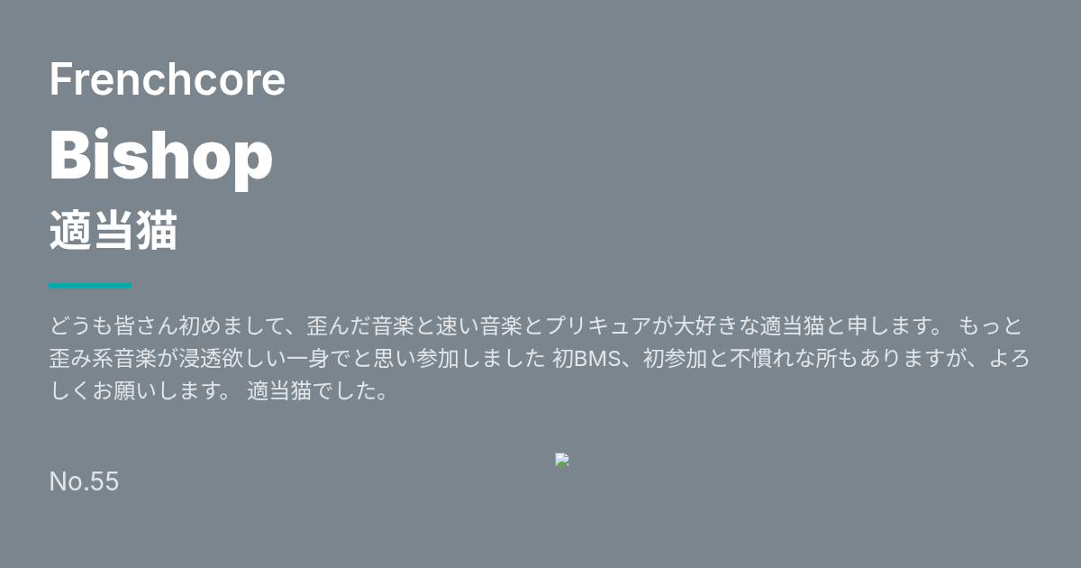 どうも皆さん初めまして、歪んだ音楽と速い音楽とプリキュアが大好きな適当猫と申します。 もっと歪み系音楽が浸透欲しい一身でと思い参加しました 初BMS、初参加と不慣れな所もありますが、よろしくお願いします。 適当猫でした。