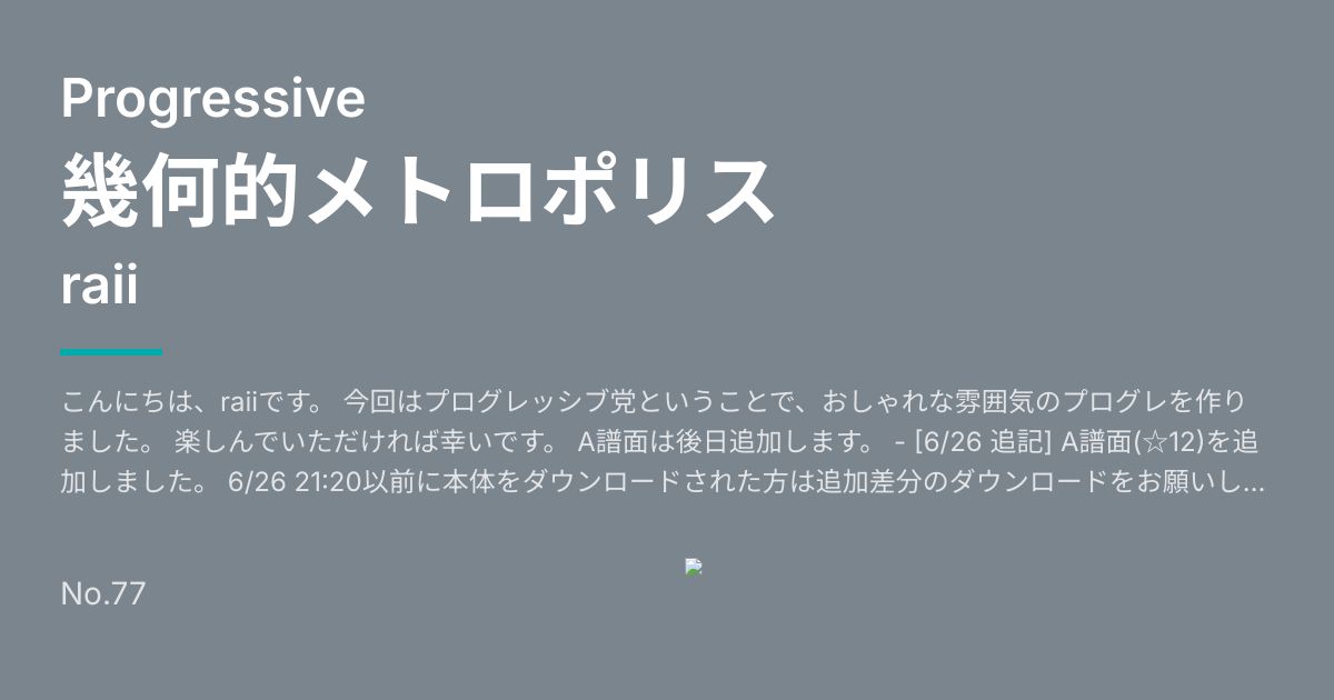 こんにちは、raiiです。 今回はプログレッシブ党ということで、おしゃれな雰囲気のプログレを作りました。 楽しんでいただければ幸いです。 A譜面は後日追加します。 - [6/26 追記] A譜面(☆12)を追加しました。 6/26 21:20以前に本体をダウンロードされた方は追加差分のダウンロードをお願いします。 - [7/18 追記] 登録URLからダウンロードできなくなっていたのでURLを修正しました。
