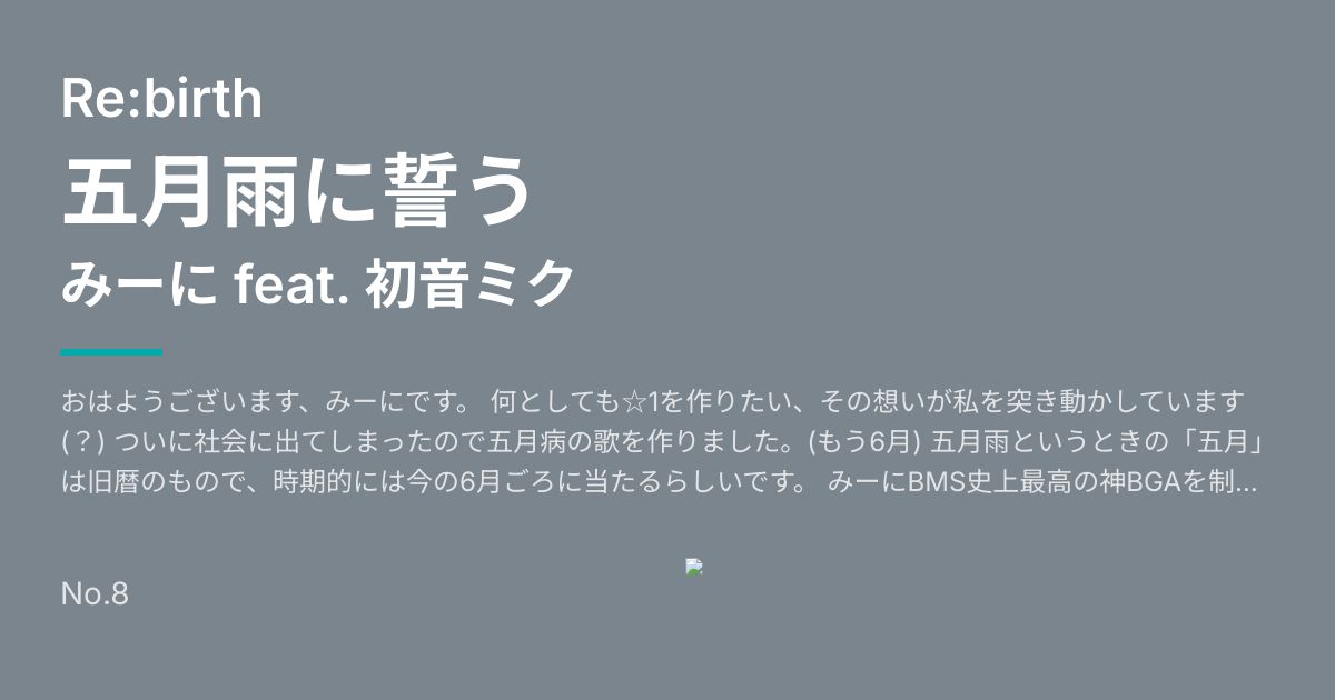 おはようございます、みーにです。 何としても☆1を作りたい、その想いが私を突き動かしています(?) ついに社会に出てしまったので五月病の歌を作りました。(もう6月) 五月雨というときの「五月」は旧暦のもので、時期的には今の6月ごろに当たるらしいです。 みーにBMS史上最高の神BGAを制作してくださったのはtolz先生( @to10to10to10to )です! 本当にありがとうございました!