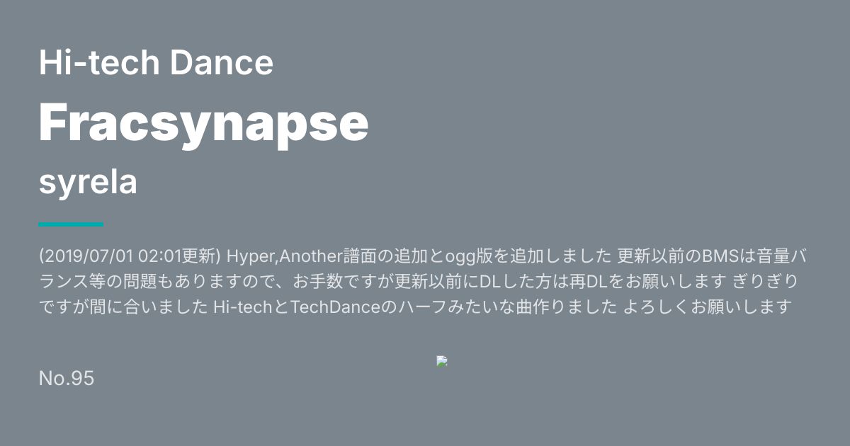 (2019/07/01 02:01更新) Hyper,Another譜面の追加とogg版を追加しました 更新以前のBMSは音量バランス等の問題もありますので、お手数ですが更新以前にDLした方は再DLをお願いします ぎりぎりですが間に合いました Hi-techとTechDanceのハーフみたいな曲作りました よろしくお願いします