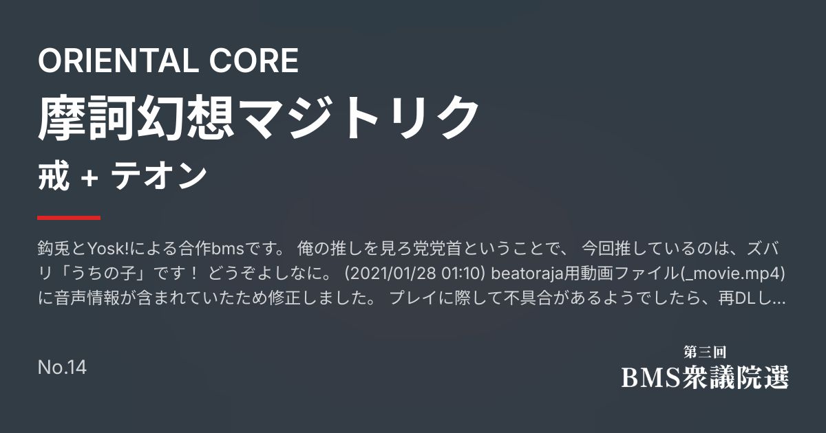 鈎兎とYosk!による合作bmsです。 俺の推しを見ろ党党首ということで、 今回推しているのは、ズバリ「うちの子」です! どうぞよしなに。 (2021/01/28 01:10) beatoraja用動画ファイル(_movie.mp4)に音声情報が含まれていたため修正しました。 プレイに際して不具合があるようでしたら、再DLしていただくことで改善するかもしれません。 ご迷惑をおかけし申し訳ありません。