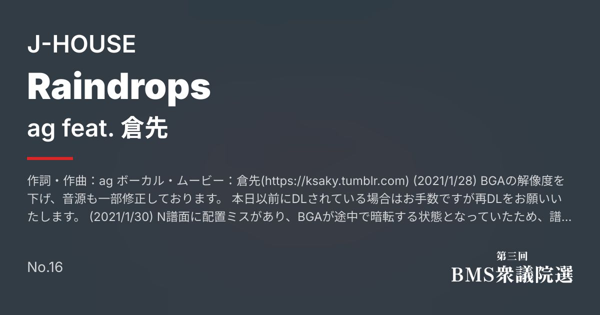 作詞・作曲:ag ボーカル・ムービー:倉先(https://ksaky.tumblr.com) (2021/1/28) BGAの解像度を下げ、音源も一部修正しております。 本日以前にDLされている場合はお手数ですが再DLをお願いいたします。 (2021/1/30) N譜面に配置ミスがあり、BGAが途中で暗転する状態となっていたため、譜面を修正しております。 本日以前にDLされている場合はお手数ですが再DLをお願いいたします。