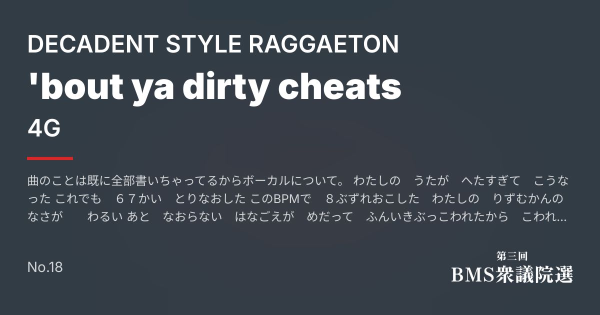 曲のことは既に全部書いちゃってるからボーカルについて。 わたしの うたが へたすぎて こうなった これでも 67かい とりなおした このBPMで 8ぶずれおこした わたしの りずむかんの なさが わるい あと なおらない はなごえが めだって ふんいきぶっこわれたから こわれない ぎりぎりまで おんりょうさげた ほんとうは さげたくなかった かゆ うま -------------------------------------------------------------------------------- DPの布教あきらめんからな~ -------------------------------------------------------------------------------- レゲトンという音楽ジャンルを少しでも知っていれば 「この曲のどこがレゲトンじゃボケェ!!」となると思います。 雑に説明するとレゲトンはカリブ系のダンスホールレゲエです。 細かい違いはいっぱいありますが少なくともこんな曲じゃない。 じゃあこれは何なんだということになるのですが、ちゃんとした経緯がありまして、 実はレゲトンというジャンルそのものがよその国からツッコまれ続けているという現状があります。 曰く「金!暴力!セックス!しかないのか」とのこと。 当然従来のレゲトンが好きな人たちは「うるせーエビぶつけんぞ」と反発したわけですが、 レゲトンは好きだけど内容についていけない人もいた訳でそういう人たちがサブジャンルを作っていきました。 有名なサブジャンルにラブロマンスを重視したロマンティックスタイルレゲトンがあります。 で、「ルーツがない」とハブられた人たちが作ったレゲトンを名乗りながらある意味 アンチレゲトンともいうべき存在がいくつか見つかったのです。 デンボーを基本とし重低音で支えていながらクラブ的要素はなく、フックやヴァースの概念すらあいまいで、 一部レゲエに先祖返りしてしまっている退廃的な雰囲気を持つ楽曲が見つかったのです。 私はそれらの楽曲をとりあえずデカデントスタイルと勝手に名前つけました。勝手に名前つけました。 レゲトンの中にこんなもん見つかったぞ的な意味で作りました。後悔はしてない。 ちなみにdigってたのはYosk!氏のCeebu Yappを聞いて 知ってるジャンルの中にも掘り出し物があるかもと思ったからです。