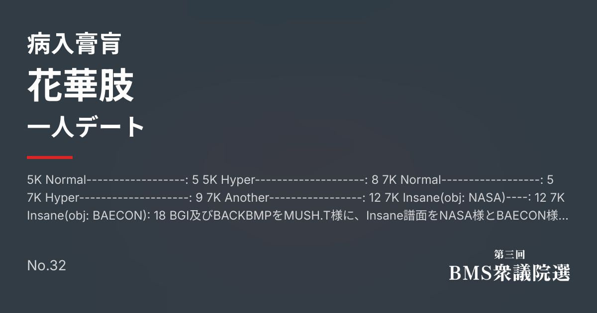 5K Normal------------------: 5 5K Hyper--------------------: 8 7K Normal------------------: 5 7K Hyper--------------------: 9 7K Another-----------------: 12 7K Insane(obj: NASA)----: 12 7K Insane(obj: BAECON): 18 BGI及びBACKBMPをMUSH.T様に、Insane譜面をNASA様とBAECON様に一種類ずつ制作していただきました。 また、Another譜面のテストプレイと譜面動画の作成・アップロードをNASA様にしていただきました。 この場をお借りしてお礼申し上げます。 読み方は「かかし」です。 BGIは、_bgi.pngと_bgi_large.pngを用意しております。 BGIの定義は、全譜面共通で「_bgi.png」にしてありますので、_bgi_large.pngをBGIにしたい場合、そちらのファイル名を_bgi.pngにしていただいて、元の_bgi.pngのファイル名を変更していただけたら大丈夫です。