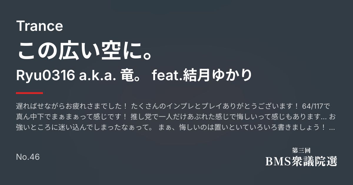 遅ればせながらお疲れさまでした! たくさんのインプレとプレイありがとうございます! 64/117で真ん中下でまぁまぁって感じです! 推し党で一人だけあぶれた感じで悔しいって感じもあります... お強いところに迷い込んでしまったなぁって。 まぁ、悔しいのは置いといていろいろ書きましょう! 曲について 真面目にTranceやってみよう! って二年前に一回没になってたプロジェクトファイルを保存した近い日に書き足してた曲になります。 (プロジェクト名がbotutra331.flpってなかなかなファイル名のまま) 結局ハードトランス,エナジェ的リフの入れ方をして手癖全開みたいなTranceになります。 (過去作Dioneを聴いていただければ http://manbow.nothing.sh/event/event.cgi?action=More_def&num=9&event=93) そしてボーカルトランスくれ~ってリクエストからも形になってます、感謝。 後は音切りやだーってくらいオートメーション使ってたので結構寝かしてた感じがありますね... 詞について 開放感的にそんな感じの詞になりました(?) 困ったら空に飛び出せ! 推しについて 勘違いが少々起きてる気がしますがSynth1と結月ゆかり両方です! Synth1はDTM初からの付き合いなのと、ゆかりさんに関しては自分の幅を広げてくれた存在なので。 ブレイクでは結月ゆかりV4でラスサビに重ねてCevioAiを使っていますが発売日直後に重ねたので、 ちょっと今後の扱いは模索中です。 Synth1は今回は使ってないけどOTTを知ったのでもうちょっとパキッとできることが分かった! ちなみにSynth1とゆかりさんをミュートにするとこうなります。 https://twsound.net/sound/ffb24c8e4634b5d144205eaed482a547 譜面について 乱打を乱発する音の動きなので繰り返しになりまくるから全譜面実は結構悩んだ。 あと縦連も嫌いすぎてずらしたのが多かったのが少し良くなった。 BPM遅いから普通に入れてもよかったなと思ってます。 小節線はもうやらないと気がすまなくなってきた! N譜面を改めてプレイすると結構難しかった。 でもN譜面でもいろんな要素が楽しめるってことで許して! 一枚絵について MMDゆかり穏モデルをお借りしつつ、洞窟のような場所はBlenderをこねこねして作り上げました! Aviutlで後からエフェクトを足しています。 https://twitter.com/xryuzix/status/1355364139913240577 名義について 今後ゆかりさんを含んだ場合でもRyu0316 a.k.a. 竜。名義にしていきます。 少々長くなりますがお許しください。 適当にインプレに反応してこ! >メインメロのリリース 多分リフメロのことだと思いますが、パキッとしようといろいろ短くなってるのが原因ですね... >(本推しは)ゆかりさんでしょう はい。 >譜面 A譜面の最後にN譜面のようにLNを入れるか迷いましたが複雑になりそう、好みが分かれそうみたいな変な抑制が出てしまいました。 "黒い空から"とか"自由"などの黒譜面を作ればよかったかなと今更思っています。 Totalの話になるともともとゲージの重さを込みでA12にするつもりだったけどノーツのわりに簡単めかな? と思い11にしていました。ゾロ目は特に意味はないのですが癖です。 アクセント的なLNや連皿が意外と好評ですこしうれしい。 >い つ も の 改めて自分で曲を分析,解析してると いつものだったわ... って感じです。 >哀愁 なぜか出る定期、とはいえ哀愁と壮大は最高の組み合わせなので! >王道トランス、オールド感 久しぶりにABサビな展開を離れて作ったものなんで実際よくわかってない(?) 私の中のトランスがこれなので古いのかすら分からないという... >今風なトランス作って! これについては個別にリファレンスを何曲かいただきたい。 >Synth1 Synth1はいいぞ。 今回は未使用ですがOTTによりさらに可能性を感じた。 ドラム隊も全部作るのは過去にBMSでフルSynth1をやってるのですが、しょぼくなってしまいそうなのと たまたま完成した曲のSynth1使用率が8割仕様だっただけなので、差し替えるのも雰囲気が壊れそうだったので止めました。 >exVoice いいぞ。 >ボーカル ブレイクのところはディエッサーが弱いかHiを上げすぎか、 ほかの音が高音域を鳴らしてるので重なって刺さってる可能性があるかもしれないです。 そのほか聞き取り辛い、弱いなど、ボーカル調声は永遠の課題ですね... >お気に入り、最推し ありがたい限り! よくわからなくなってきたのでこの辺で! 改めてプレイおよびインプレありがとうございました! 推し党ありがとう! ポップスめでてぇ! ってことで、またどこかで! __________________________________ 私の推しといえばー? \せーの/ 私「Synth1!」 一同「結月ゆかり!」 「...?」 (どっちも大好きです。この曲のシンセの8割位はSynth1でできています。)