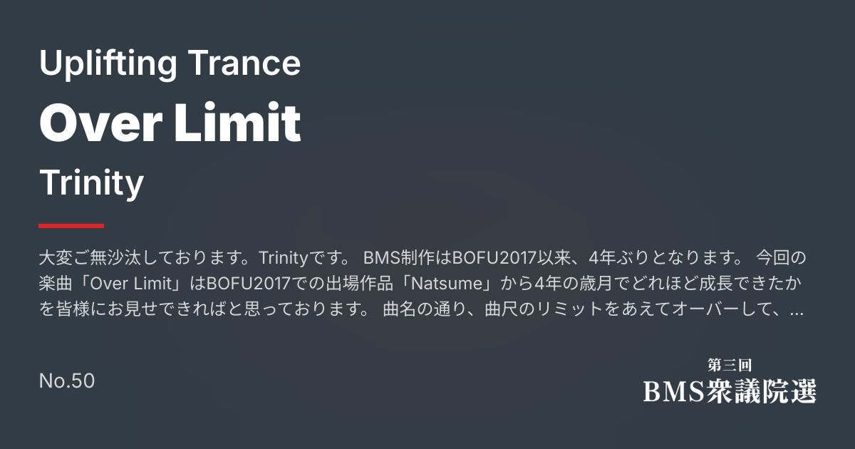 大変ご無沙汰しております。Trinityです。 BMS制作はBOFU2017以来、4年ぶりとなります。 今回の楽曲「Over Limit」はBOFU2017での出場作品「Natsume」から4年の歳月でどれほど成長できたかを皆様にお見せできればと思っております。 曲名の通り、曲尺のリミットをあえてオーバーして、Trance特有の長尺、破壊力抜群のキックとベースを国民の皆様にお届けいたします。