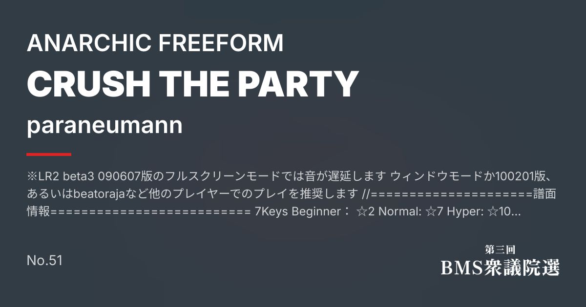 ※LR2 beta3 090607版のフルスクリーンモードでは音が遅延します ウィンドウモードか100201版、あるいはbeatorajaなど他のプレイヤーでのプレイを推奨します //=====================譜面情報========================== 7Keys Beginner: ☆2 Normal: ☆7 Hyper: ☆10 Another: ☆11 Insane: ☆12 14Keys Normal: ☆7 Hyper: ☆10 Another: ☆12 ____________________________________________ 第三回BMS衆院選候補 無所属 paraneumann ■■歳 無名戦17を出発点に、自炊的BMS活動家となり、イベントに通算5作品発表し現在にいたる では続いて、paraneumannさんの政見放送です ____________________________________________ 有権者諸君 私がparaneumannである 私には建設的な提案なんかひとつも無い! 今はただスクラップ&スクラップ! すべてをぶち壊すことだ crash a partyで「招待されていないパーティに乱入する」という意味になる じゃcrush the partyならどうなるか その話は……長くなるから……readmeを読んでくれ 今回は久々にDP譜面も作ったから、イベント期間中でも終わってからでもかまわない 遊んでくれ 最後に一応言っておく 私が当選したら奴らはビビる! 私もビビる ____________________________________________ 無所属 paraneumannさんの政見放送でした