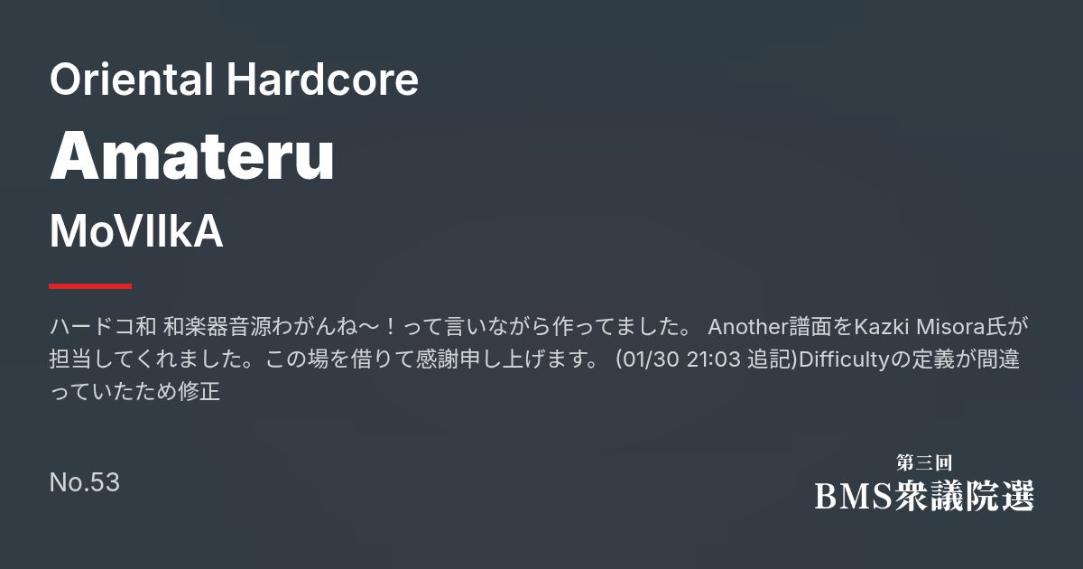 ハードコ和 和楽器音源わがんね~!って言いながら作ってました。 Another譜面をKazki Misora氏が担当してくれました。この場を借りて感謝申し上げます。 (01/30 21:03 追記)Difficultyの定義が間違っていたため修正