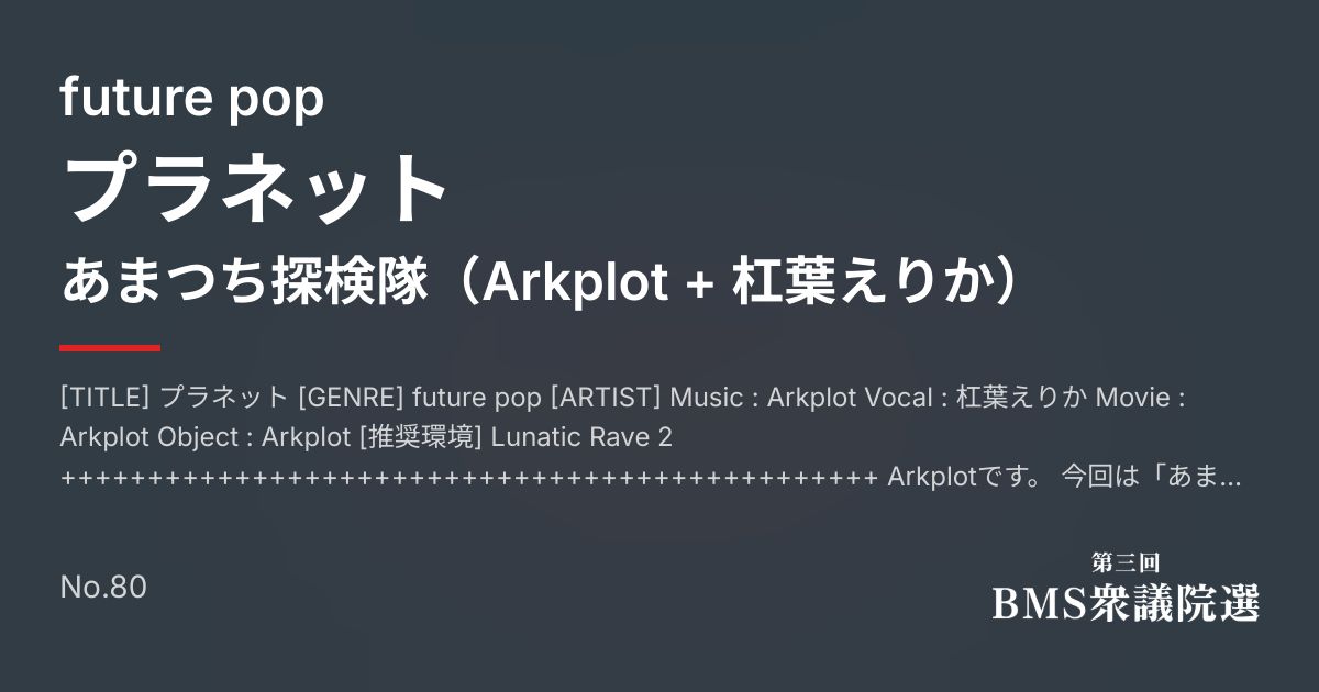 [TITLE] プラネット [GENRE] future pop [ARTIST] Music : Arkplot Vocal : 杠葉えりか Movie : Arkplot Object : Arkplot [推奨環境] Lunatic Rave 2 +++++++++++++++++++++++++++++++++++++++++++++++ Arkplotです。 今回は「あまつち探検隊」として、杠葉えりかさんとコラボレーションしました。 作品のコンセプトは「宇宙の旅」となっています。 (ポップスって何だろう…) この不思議な雰囲気…どなたかに刺さればいいなーと思いながら制作しました。 杠葉えりかさんの透明な歌声に酔いしれてください。 さて、今後ともArkplotをよろしくお願いいたします =============================================== ■ Arkplot twitter - https://twitter.com/arkplot SoundCloud - https://soundcloud.com/arkplot ■ 杠葉えりか twitter - https://twitter.com/yuzuriha_erika HP - https://yuzurihaerika97.wixsite.com/mysite ===============================================