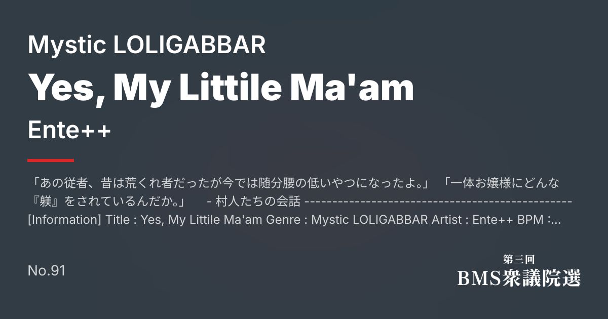 「あの従者、昔は荒くれ者だったが今では随分腰の低いやつになったよ。」 「一体お嬢様にどんな『躾』をされているんだか。」 - 村人たちの会話 ------------------------------------------------[Information] Title : Yes, My Littile Ma'am Genre : Mystic LOLIGABBAR Artist : Ente++ BPM : 175.00 Event : 第三回BMS衆議院選 Party:歪み新党 Difficulty : [SPB] ☆☆ (2, 218notes) [SPN] ☆☆☆☆☆ (5, 520notes) [SPH] ☆☆☆☆☆☆☆☆ (8, 696notes) [SPA] ☆☆☆☆☆☆☆☆☆☆☆ (11, 1086notes) ********************************************* [Comment] 歪み新党より出馬いたしましたEnteと申します。 今回のテーマは『齢数百歳の吸血鬼』です。 それに最近の肌寒さを混ぜ込んだ結果、曲ができました。 いつもとはちょっと違う曲調も入っているので名義にも+αしてみました。 不気味さと可愛さとハードコアっぽさを感じていただければ幸いです。 ジャンル名はくるやのぶさんに許可をいただいてLOLIGABBARです。語感が良すぎますね。