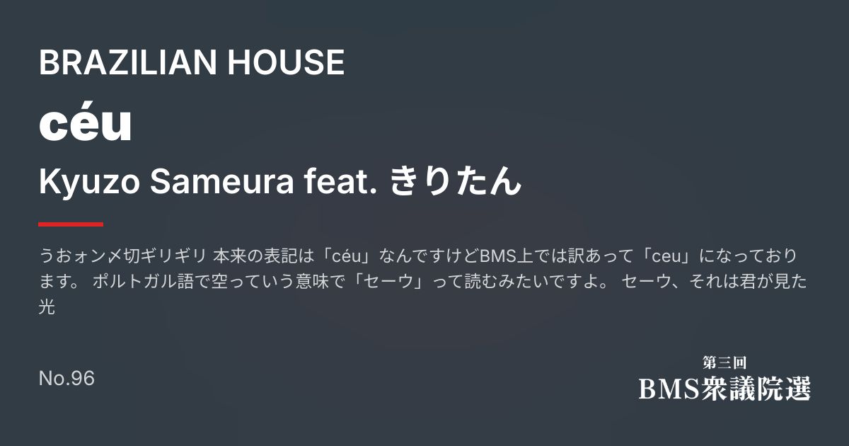 うおォン〆切ギリギリ 本来の表記は「céu」なんですけどBMS上では訳あって「ceu」になっております。 ポルトガル語で空っていう意味で「セーウ」って読むみたいですよ。 セーウ、それは君が見た光