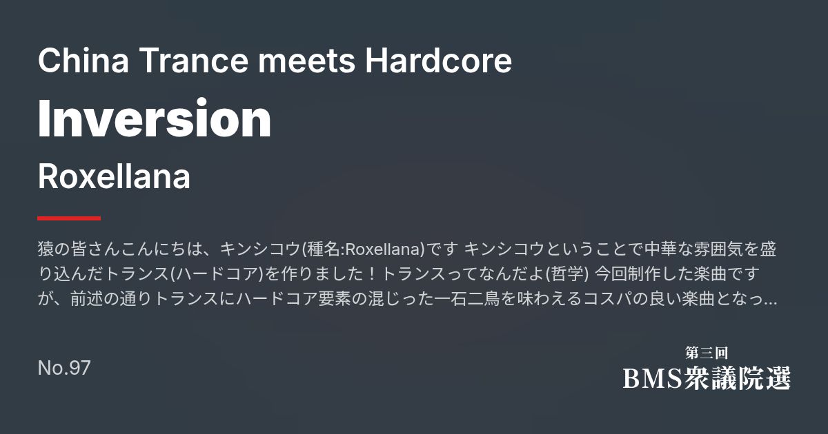 猿の皆さんこんにちは、キンシコウ(種名:Roxellana)です キンシコウということで中華な雰囲気を盛り込んだトランス(ハードコア)を作りました!トランスってなんだよ(哲学) 今回制作した楽曲ですが、前述の通りトランスにハードコア要素の混じった一石二鳥を味わえるコスパの良い楽曲となっております。普段は穏やかな性格のキンシコウですがガバキックによってInversionしてしまったようです。悲しいね そのカオスさが譜面にも現れているので是非プレイしてみてください! あっ、おい待てぃ(北京っ子)肝心な譜面シバき忘れてるゾ(差分SARU:★24)