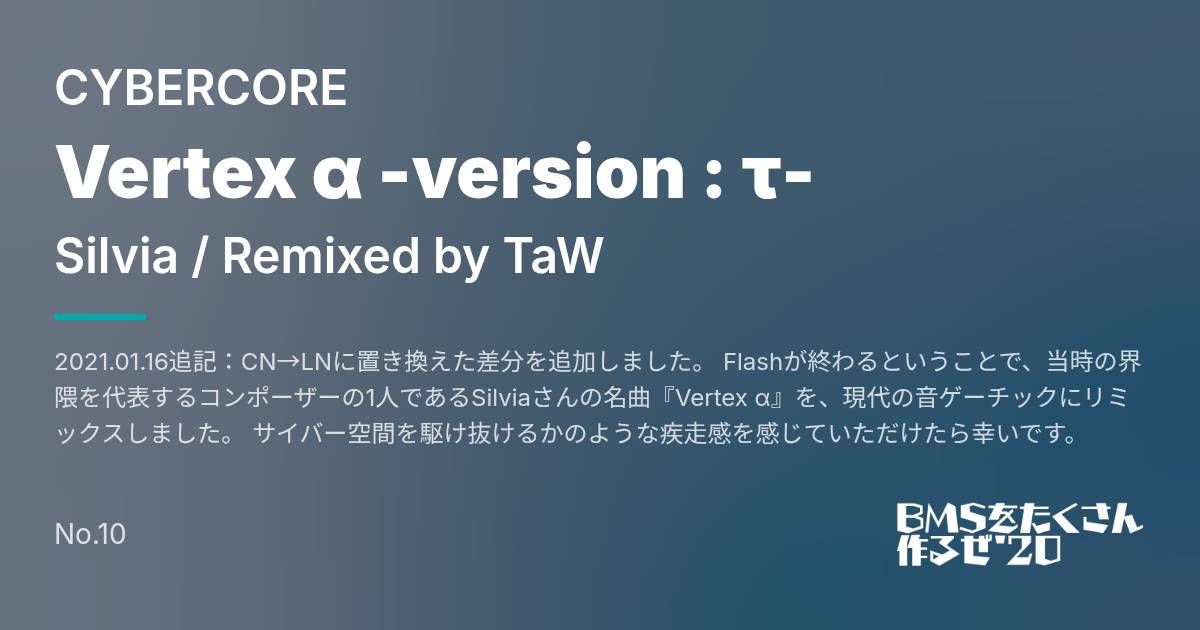 2021.01.16追記:CN→LNに置き換えた差分を追加しました。 Flashが終わるということで、当時の界隈を代表するコンポーザーの1人であるSilviaさんの名曲『Vertex α』を、現代の音ゲーチックにリミックスしました。 サイバー空間を駆け抜けるかのような疾走感を感じていただけたら幸いです。