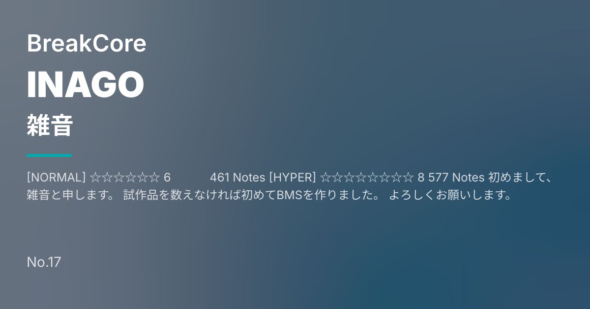 [NORMAL] ☆☆☆☆☆☆ 6 461 Notes [HYPER] ☆☆☆☆☆☆☆☆ 8 577 Notes 初めまして、雑音と申します。 試作品を数えなければ初めてBMSを作りました。 よろしくお願いします。