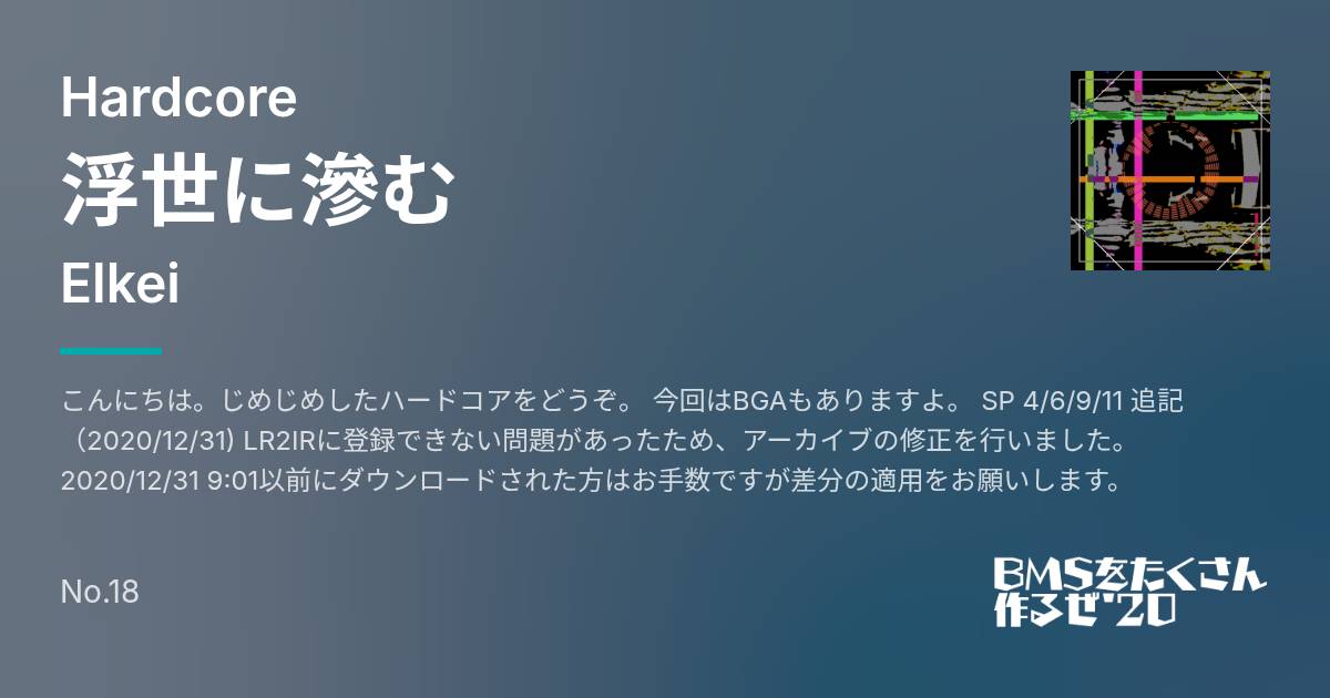 こんにちは。じめじめしたハードコアをどうぞ。 今回はBGAもありますよ。 SP 4/6/9/11 追記(2020/12/31) LR2IRに登録できない問題があったため、アーカイブの修正を行いました。 2020/12/31 9:01以前にダウンロードされた方はお手数ですが差分の適用をお願いします。