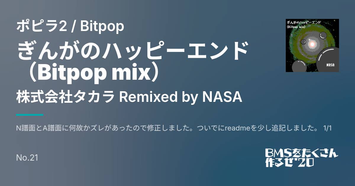 N譜面とA譜面に何故かズレがあったので修正しました。ついでにreadmeを少し追記しました。 1/1 23:00以前にDLした人は修正お願いします。 ------------------------------------------------------------------------------------ どうもNASAです。 突然ですがみなさん「ポピラ」ってゲーム知ってますか? 叩いたノーツ(鉄球)が消えるのではなく"跳ね返る"という、 前代未聞の設定で世に送り出された株式会社タカラ(現タカラトミー)の音ゲーです。 ボタンは4つしかないものの、前述のノーツが消えないことに加え、ボタンの跳ね返りが弱い、 許容ミスは8個まで、対象年齢が6歳とは思えない高難易度譜面といった荒くれ設定に 一部熱狂的なファンがいるとかいないとか。 コレによって、少年時代のNASAは友人宅で早々に音ゲーの洗礼を受けていました。 そんなゲームの2作目のED曲をアレンジしました。 ついでにEDでありラスボスな当時の譜面も同梱しました。6歳向けゲームの本気をご覧あれ!