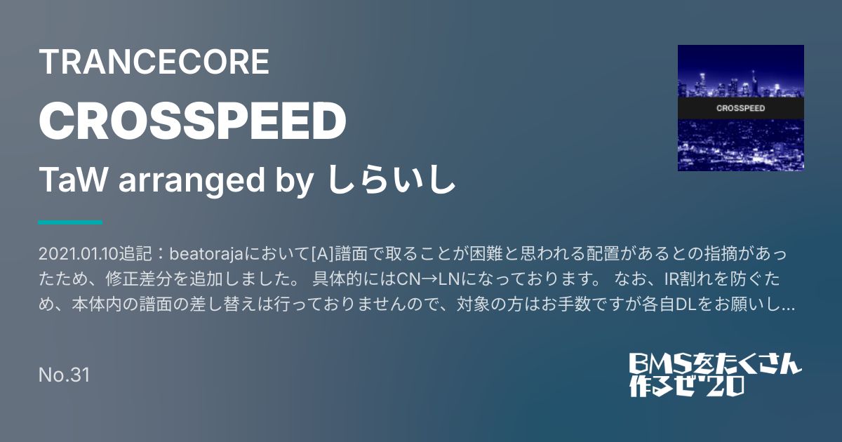 2021.01.10追記:beatorajaにおいて[A]譜面で取ることが困難と思われる配置があるとの指摘があったため、修正差分を追加しました。 具体的にはCN→LNになっております。 なお、IR割れを防ぐため、本体内の譜面の差し替えは行っておりませんので、対象の方はお手数ですが各自DLをお願いします。 2021.01.03追記:LR2でBGAが正常に表示されないという不具合が報告されています。原因は目下調査中ですが、beatorajaでは正常に表示されるため、BGAを見ながらプレーしたい方はbeatoraja上でのプレーを推奨します。 ※注意※ 本BMSのBGAにはフラッシュや点滅等を多用した表現が含まれています。 X系統の曲以外でしらいしさんと合作するのは初ですね。 BGAと譜面から「何か」を感じ取っていただけると幸いです。
