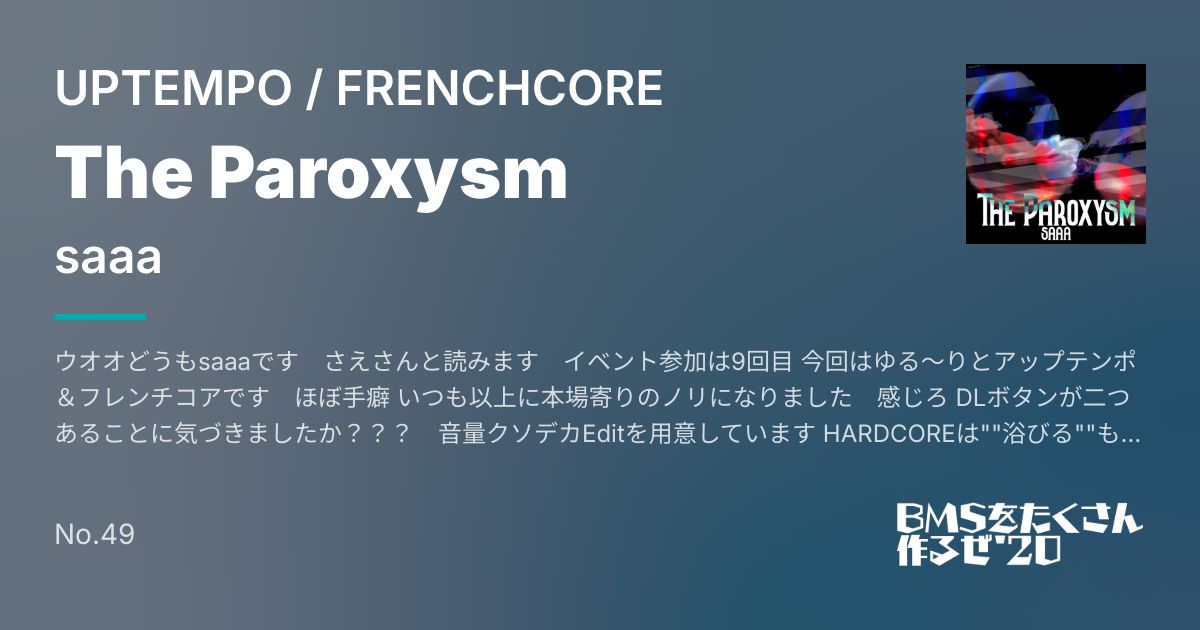 ウオオどうもsaaaです さえさんと読みます イベント参加は9回目 今回はゆる~りとアップテンポ&フレンチコアです ほぼ手癖 いつも以上に本場寄りのノリになりました 感じろ DLボタンが二つあることに気づきましたか??? 音量クソデカEditを用意しています HARDCOREは""浴びる""ものだと思っている人は是非こちらもDLしてプレイしてみてください IR割れしないので安心 今作では初めてベリハ譜面を作成しました これも人生経験の一環 食わず嫌いはいけない 専コンorajaでノマゲまで守りました Artist : saaa Level(7key) NORMAL:☆☆☆☆☆☆☆ [7] HYPER:☆☆☆☆☆☆☆☆☆ [9] ANOTHER:☆☆☆☆☆☆☆☆☆☆☆ [11] 発作:???????????? [ベリハ判定]