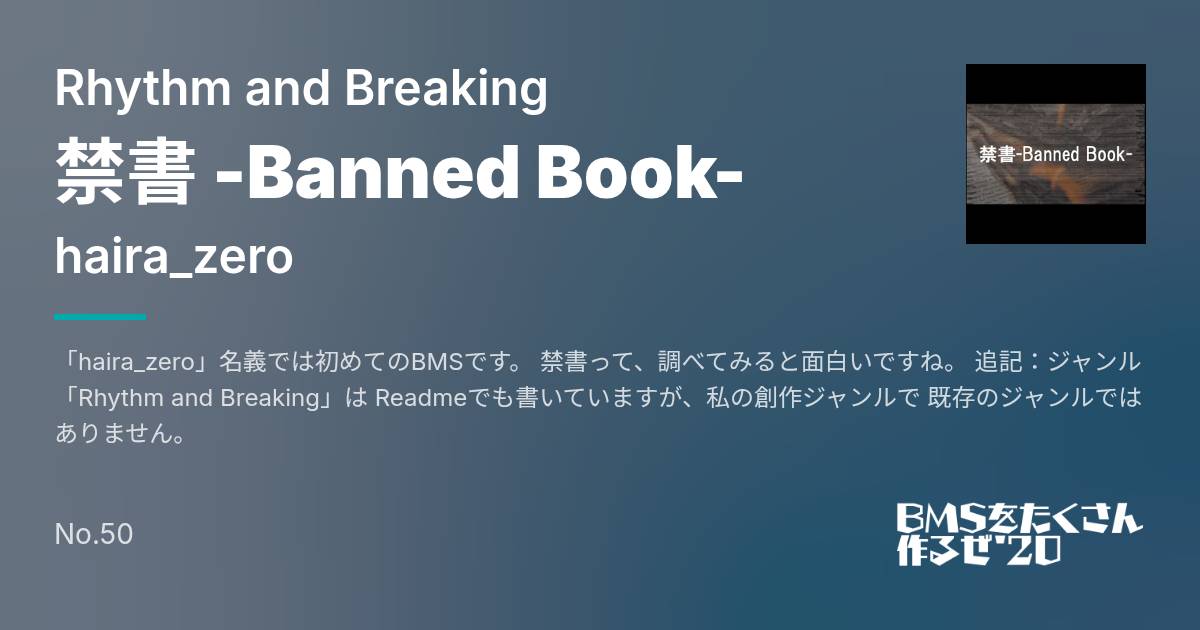 「haira_zero」名義では初めてのBMSです。 禁書って、調べてみると面白いですね。 追記:ジャンル「Rhythm and Breaking」は Readmeでも書いていますが、私の創作ジャンルで 既存のジャンルではありません。