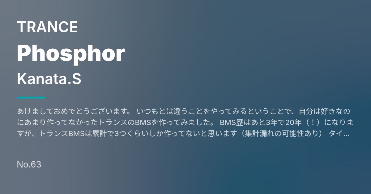 あけましておめでとうございます。 いつもとは違うことをやってみるということで、自分は好きなのにあまり作ってなかったトランスのBMSを作ってみました。 BMS歴はあと3年で20年(!)になりますが、トランスBMSは累計で3つくらいしか作ってないと思います(集計漏れの可能性あり) タイトルは「明けの明星」の意味。とりあえず新年ってことで希望溢れる曲調で、INSANEは自分が好きなトランス系の発狂譜面を作ってみましたが、結局いつもの僕の譜面になった気がします。 というわけで次は衆議院選(締め切り一か月以内)でお会いしましょう!では!