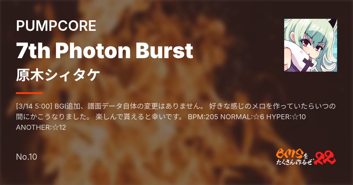[3/14 5:00] BGI追加、譜面データ自体の変更はありません。 好きな感じのメロを作っていたらいつの間にかこうなりました。 楽しんで貰えると幸いです。 BPM:205 NORMAL:☆6 HYPER:☆10 ANOTHER:☆12