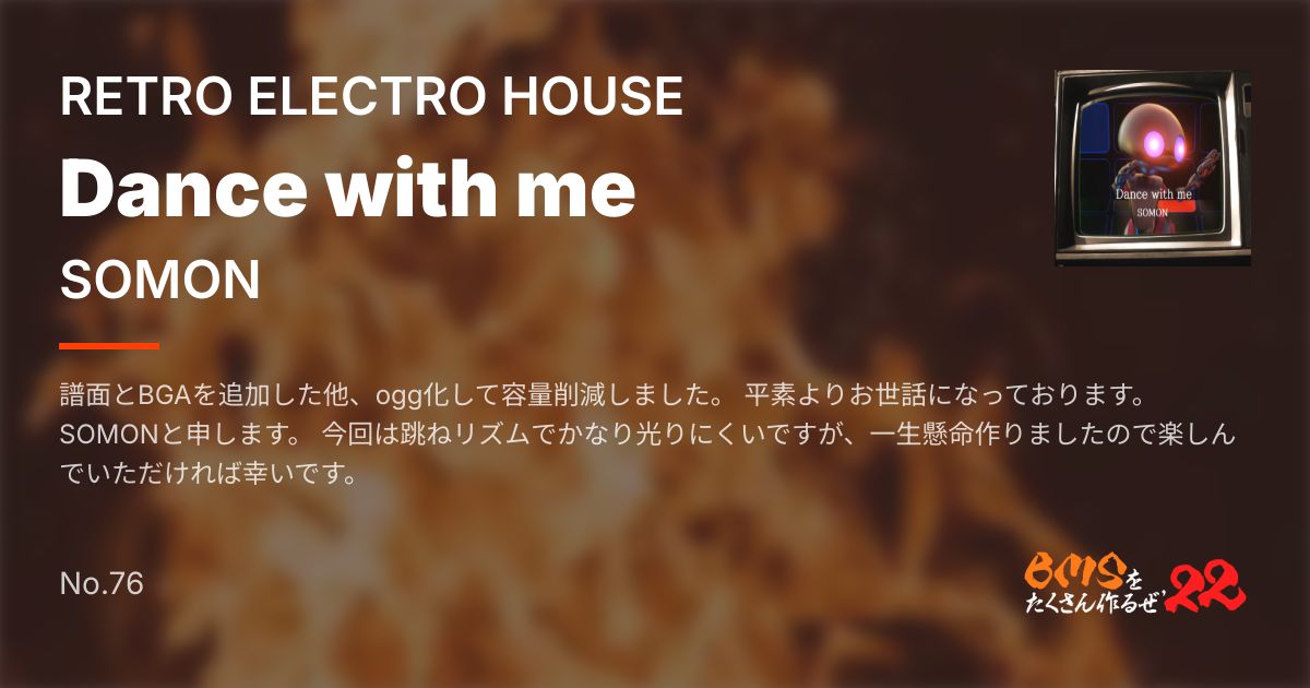 譜面とBGAを追加した他、ogg化して容量削減しました。 平素よりお世話になっております。SOMONと申します。 今回は跳ねリズムでかなり光りにくいですが、一生懸命作りましたので楽しんでいただければ幸いです。