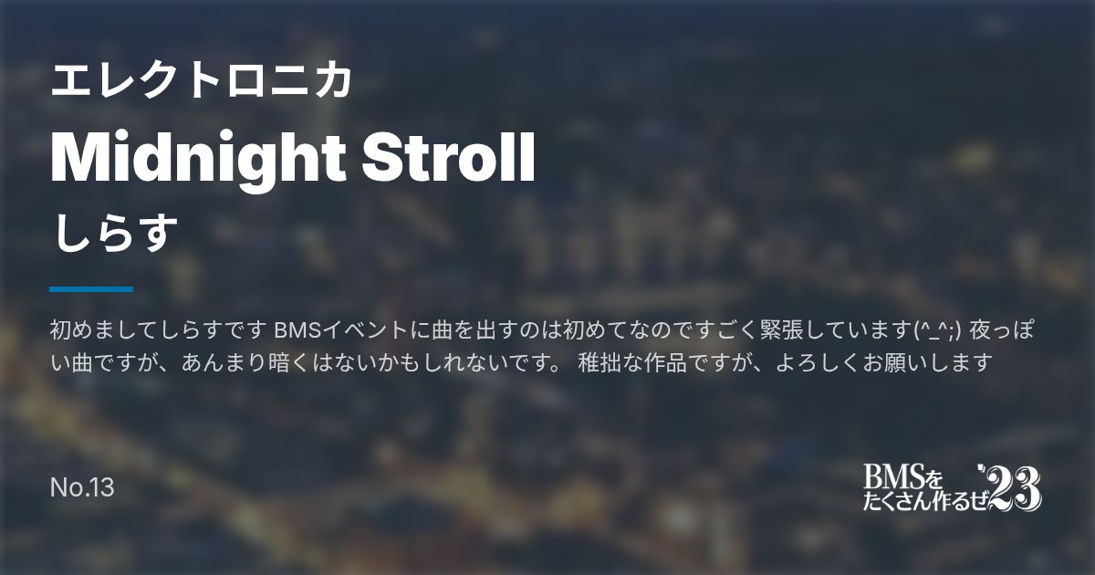 初めましてしらすです BMSイベントに曲を出すのは初めてなのですごく緊張しています(^_^;) 夜っぽい曲ですが、あんまり暗くはないかもしれないです。 稚拙な作品ですが、よろしくお願いします