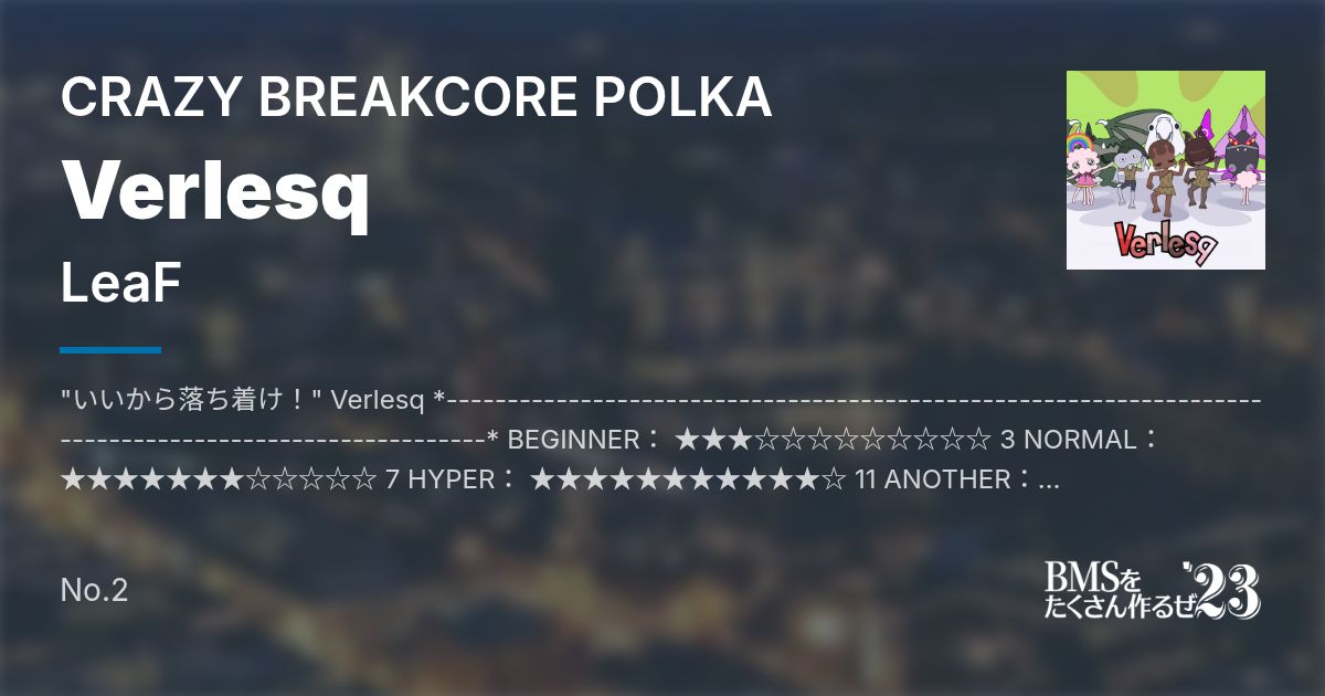 "いいから落ち着け!" Verlesq *------------------------------------------------------------------------------------------------------* BEGINNER: ★★★☆☆☆☆☆☆☆☆☆ 3 NORMAL: ★★★★★★★☆☆☆☆☆ 7 HYPER: ★★★★★★★★★★★☆ 11 ANOTHER: ★★★★★★★★★★★★ 12 INSANE: 発狂難易度★23/st4 Other: 発狂難易度★★6/st10 *------------------------------------------------------------------------------------------------------*