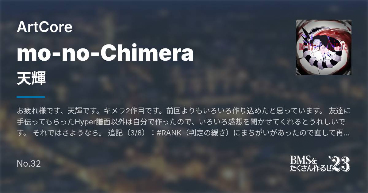 お疲れ様です、天輝です。キメラ2作目です。前回よりもいろいろ作り込めたと思っています。 友達に手伝ってもらったHyper譜面以外は自分で作ったので、いろいろ感想を聞かせてくれるとうれしいです。 それではさようなら。 追記(3/8):#RANK(判定の緩さ)にまちがいがあったので直して再アップロードしました。お手数ですが直ってない方がいたら再ダウンロードお願いします。 ------------------------------------ Music・BGI:天輝 https://twitter.com/10tel9972 ------------------------------------ obj.:oratoruk https://twitter.com/oratoruk_ ------------------------------------